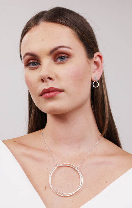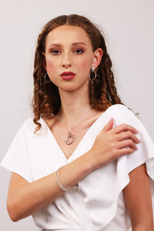 A collection of handforged sterling silver hoops, bangles, and circle pendants-each one uniquely irregular.